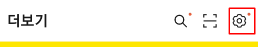 모바일 스마트폰을 이용해 '카카오톡' 어플리케이션을 실행합니다. 여기서, 설정 페이지로 이동해야 하는데요. 화면 하단에 있는 점 세개 아이콘을 터치합니다. 그리고, 상단에 있는 톱늬바퀴모양의 아이콘을 터치합니다. 톱늬바퀴 모양의 아이콘은 보여지는 화면의 '설정' 기능을 의미합니다. 우리가 원하는 것은 전체적인 기능의 설정이므로, 점세개 아이콘을 먼저 터치해야만 합니다.