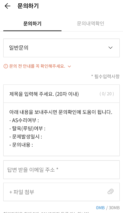 - 1번에서 자신이 찾는 내용이 없다면, 이메일 문의하기를 진행합니다. 문의하기 양식을 작성한 후, 이메일 답변을 기다리면 됩니다.
